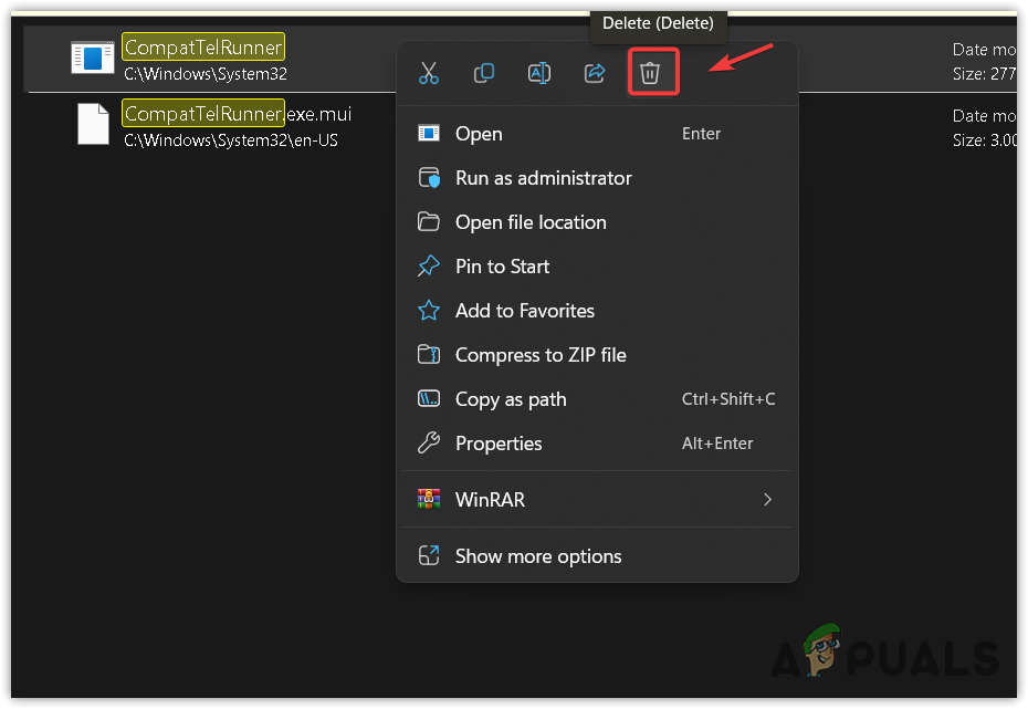 - Go back to the System 32 folder, right-click the CompatTelRunner file, and click the Delete icon.