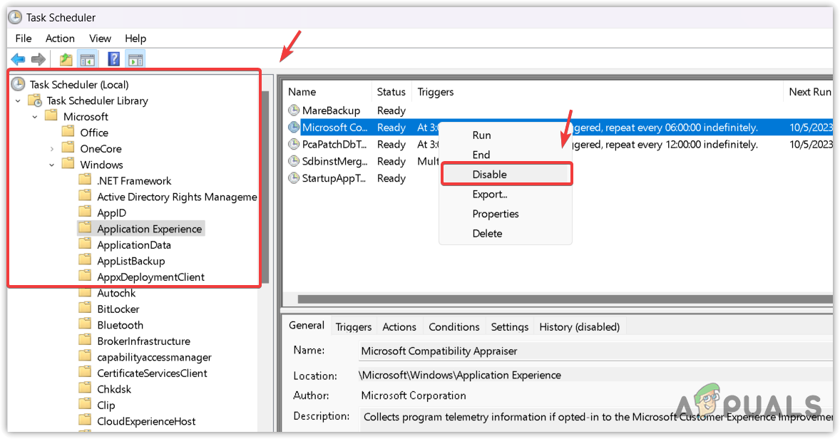 - On the right pane, right-click the Microsoft Compatibility Appraiser and click Disable.