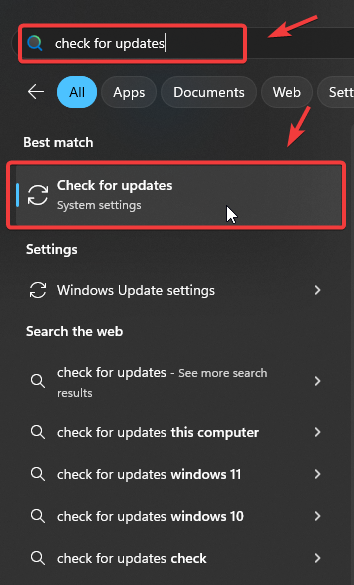 - For Windows Updates, click the Start Menu and type Check for updates.