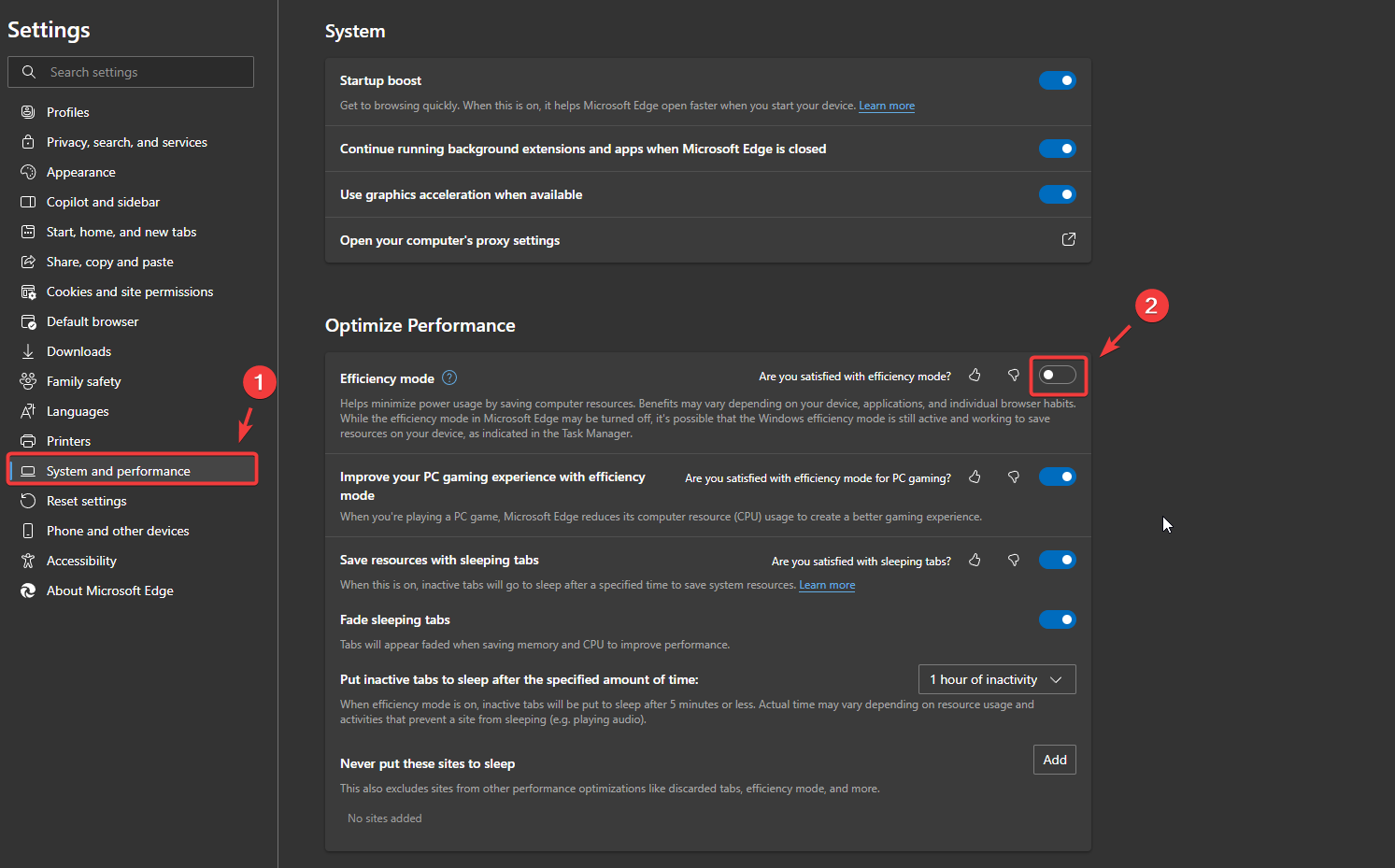 - Disable the following settings: Startup Boost and Continue running background extensions and apps when Microsoft Edge is closed.