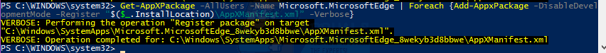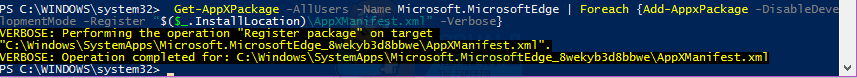 Get-AppXPackage -AllUsers -Name Microsoft.MicrosoftEdge | Foreach {Add-AppxPackage -DisableDevelopmentMode -Register “$($_.InstallLocation)\AppXManifest.xml” -Verbose}