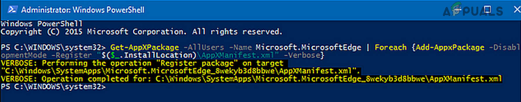 Get-AppXPackage -AllUsers -Name Microsoft.MicrosoftEdge | Foreach {Add-AppxPackage -DisableDevelopmentMode -Register “$($_.InstallLocation)\AppXManifest.xml” -Verbose}