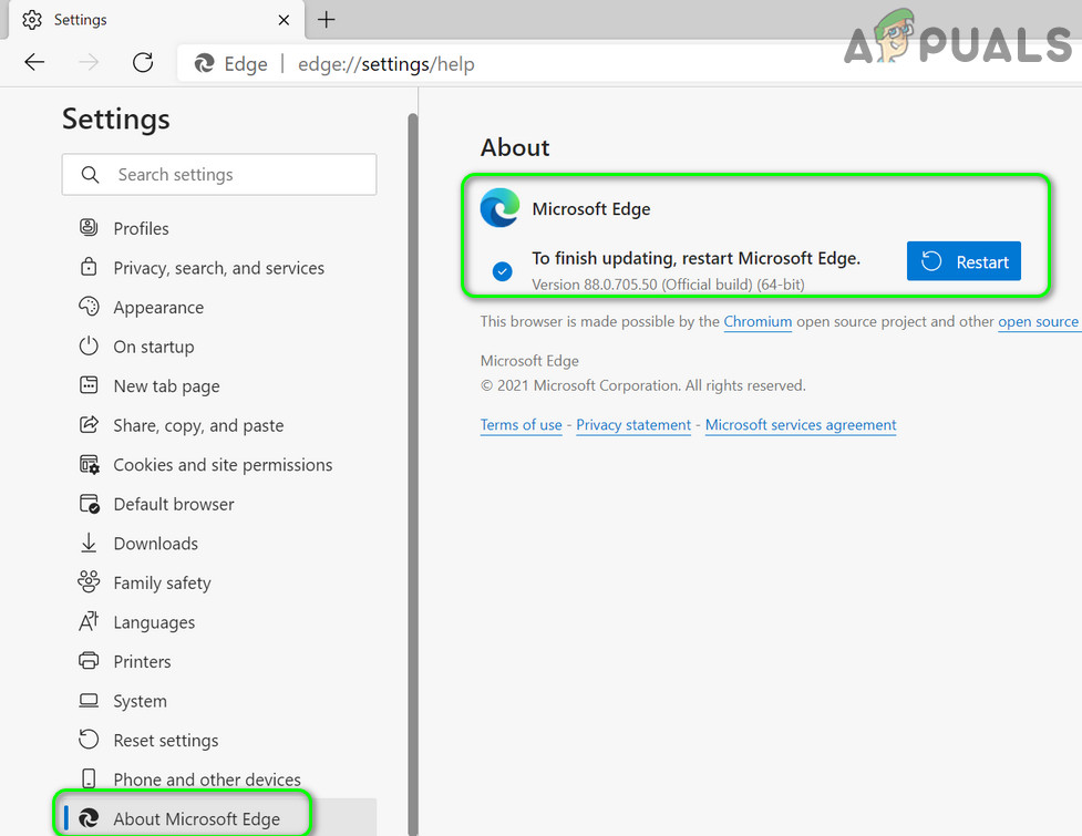 - Then, in the right pane of the window, make sure the Edge browser is updated to the latest build. You may have to Restart Edge after updating.