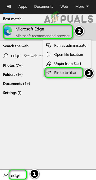 Pin Microsoft Edge to the Taskbar from the Start Menu - Now reboot your PC and then check if launching Edge from the pinned icon resolves the issue.