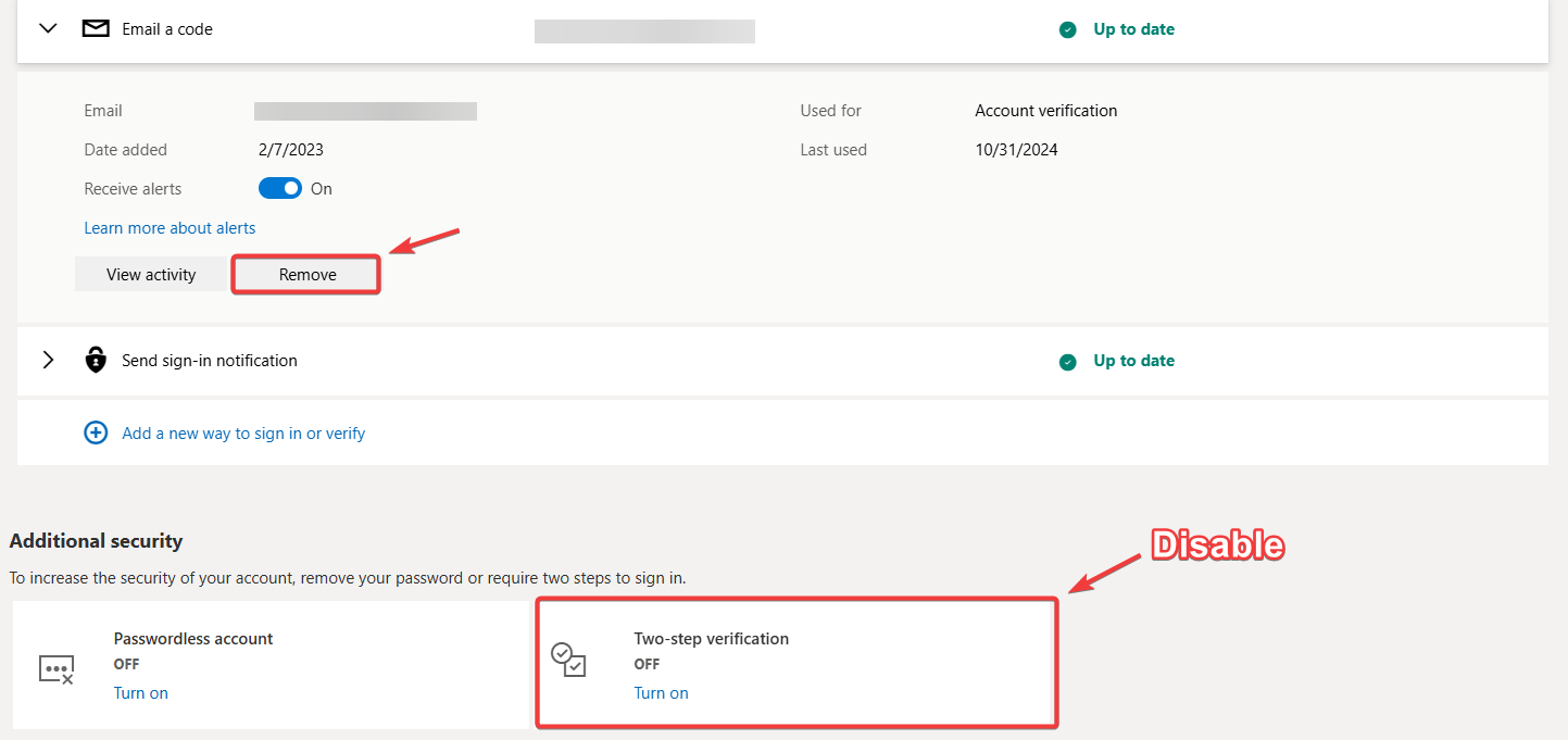 - Here, turn off all Multi-Factor Authentication options such as Text a code, send sign-in notifications, and additional security options like Passwordless account and Two-step verification.