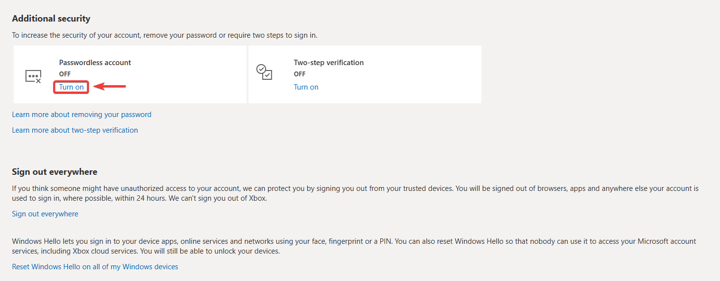 Going passwordless refers to a method of signing in to your Microsoft account using passwordless methods such as Windows Hello and the Microsoft Authenticator app. This solution seems to work for many affected users, so it’s worth trying.