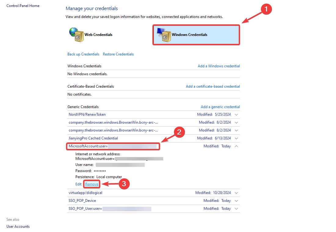 - Select Windows Credentials, expand the MicrosoftAccountUser credential, and click Remove.
