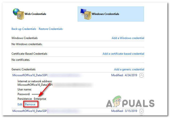 Accessing the Windows Credential Manager - Inside the Generic Credentials menu, go ahead and locate every entry corresponding to Office 15 or Office 16. As soon as you see them, click on them once to expand, then click on Remove from the context menu top to get rid of them.