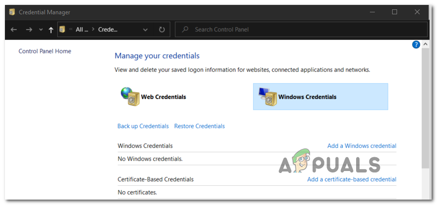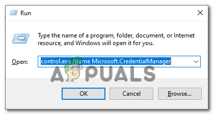 - Press Windows key + R once again to open up another Run dialog box. Inside the text box, type ‘control.exe /name Microsoft.CredentialManager’ and hit Enter or click Ok to open up Credentials Manager.