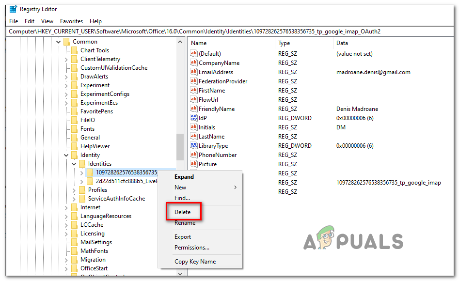 Note 2: You can either get to this location manually or you can paste the location directly into the navigation bar and press Enter to get there instantly. - Select the Identity key from the left-hand menu, then systematically right-click each one of its subfolders and click on Delete to remove them.