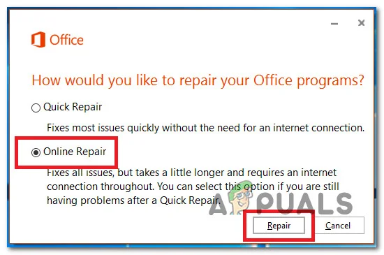 Note: Ensure you have a stable Internet connection before starting the repair, as it requires downloading files from Microsoft servers.