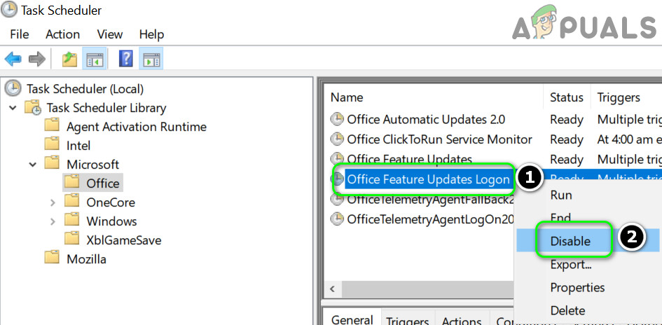 Disable Office Feature Updates Logon - Now exit the Task Scheduler and reboot your PC.