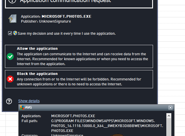 To security programs (and everywhere else, for that matter), microsoft.photos.exe has an unknown digital signature, which is why security programs alert the user when microsoft.photos.exe attempts to establish communications via the internet. Any security program that has been designed and/or configured to alert the user when applications with unknown digital signatures try to use the internet to send and receive communications will also flag any of the microsoft.photos.exe application’s attempts to do so.