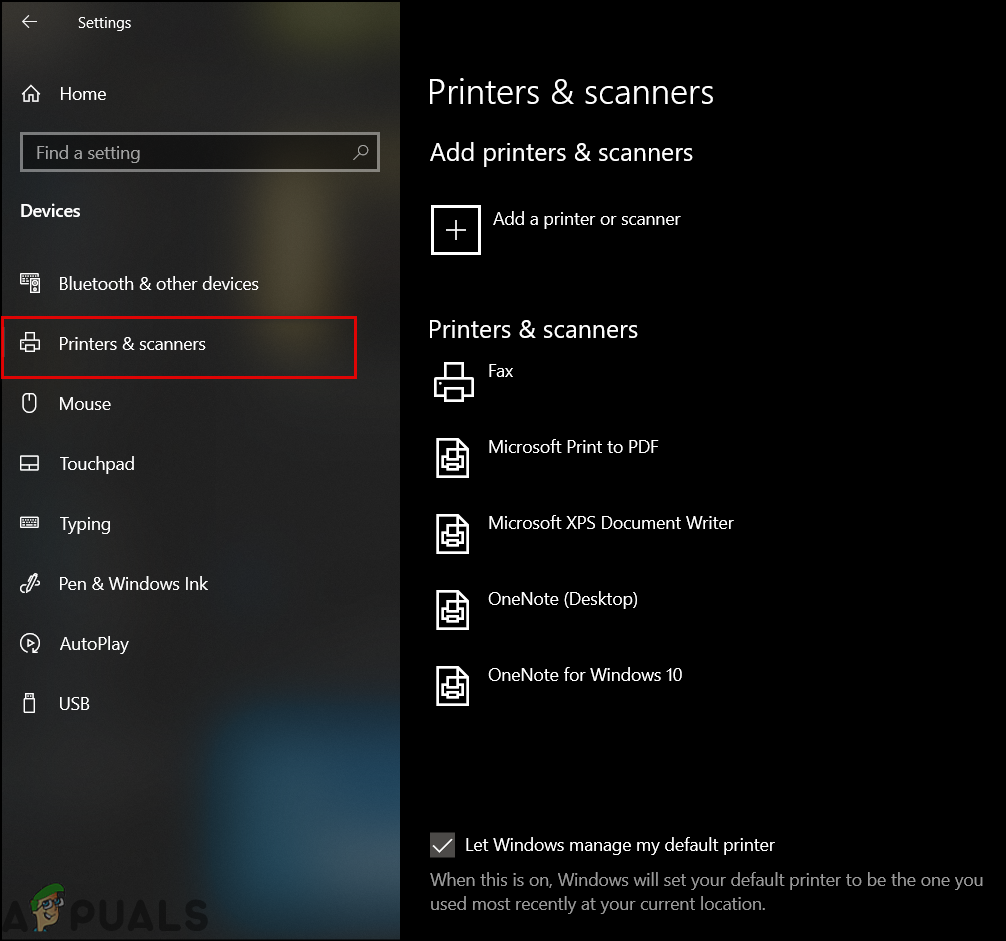 Printers and Scanners Settings - Next, deselect Let Windows manage my default printer.