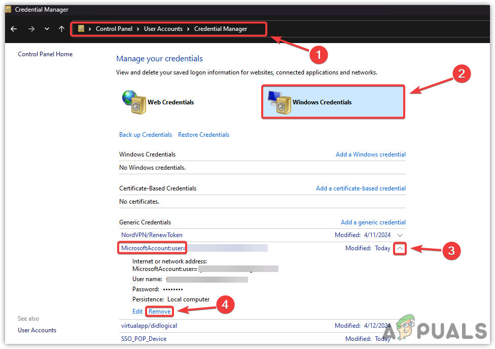 - Navigate to User Accounts > Credential Manager > Windows Credentials.