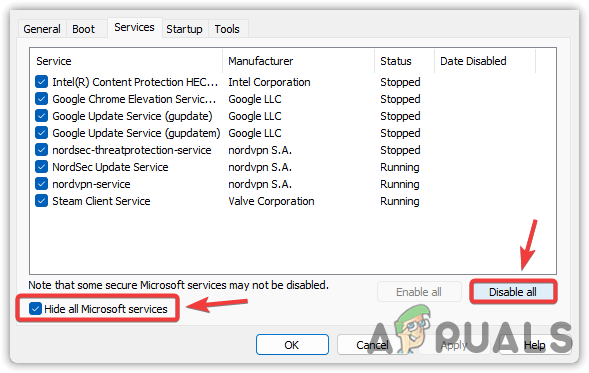 - Mark the Hide All Microsoft Services checkbox and click Disable All.
