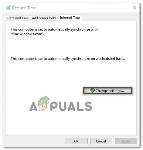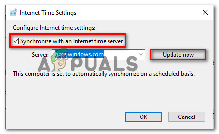 - Inside the Internet Time settings, start by checking the box associated with Synchronize with an Internet time server.