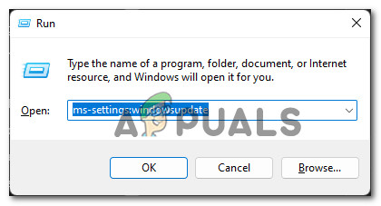 - Open up a Run dialog box by pressing Windows key + R. Once you’re inside the Run box, type ‘ms-settings:windowsupdate‘ and press Enter to open up a Run dialog box.