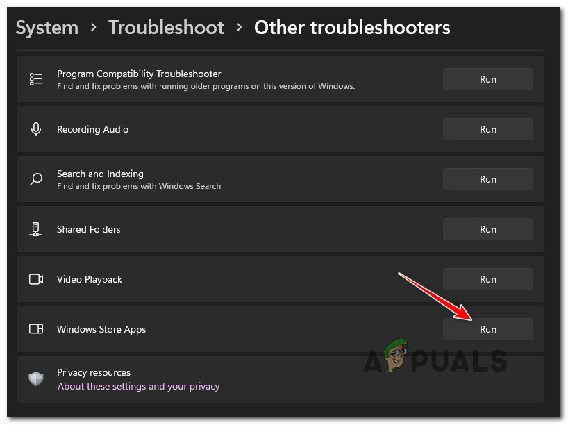Under certain situations (after a bad update, after some type of file corruption), you can expect these shared dependencies to become corrupted and affect the app retrieval process – in scenarios like this one, the best course of action is to run the Windows Apps Troubleshooter and allow the automated repair component to take care of the issue.