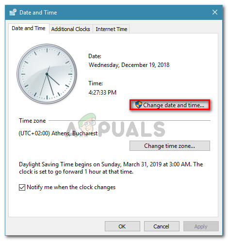 - Date and time are not correct – Keep in mind that your operating system might have trouble verifying the integrity of your UWP (Universal Windows Platform) apps if the time and date on your local computer don’t match the values expected by the Microsoft server. In this case, you can fix the issue by setting the date and time to the correct values.