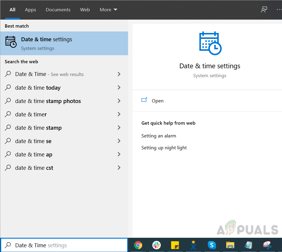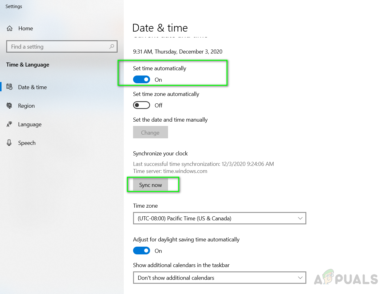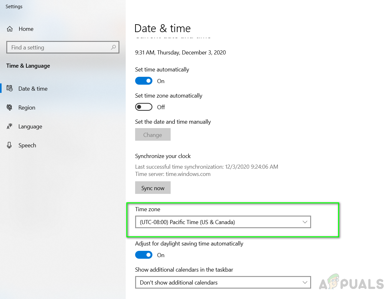 In this method, we will correct the Date and Time on the system according to the user’s Time Zone. This is very important as there are software and services that perform their authorization from the internet and if the Time or Date is incorrect then the access to those services to the resources on the internet is denied. This can be caused by some malware installed on your system to change your Time Zone or the user must have mistakenly chosen the wrong Time zone. You can avoid this by setting your Time and Date to an Internet-based Time Server.