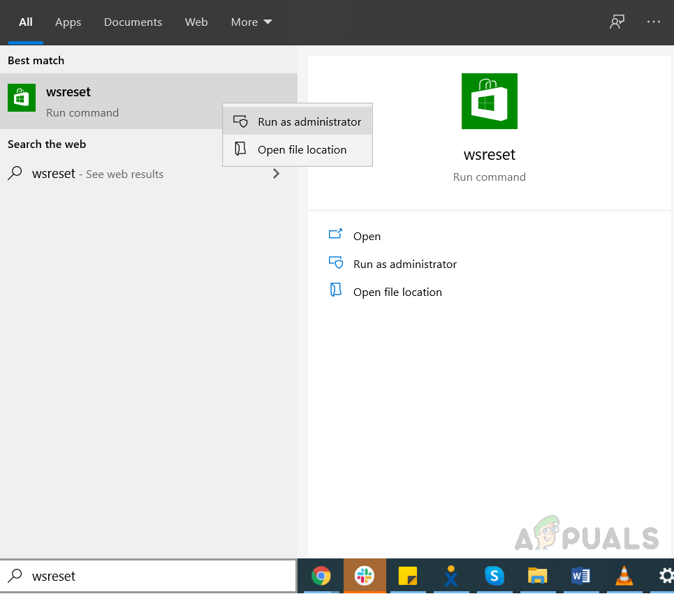- Type in wsreset in your search bar and open the application as administrator.