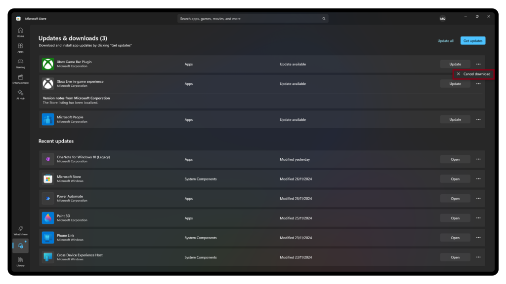 Cancelling Downloads on the Microsoft Store.