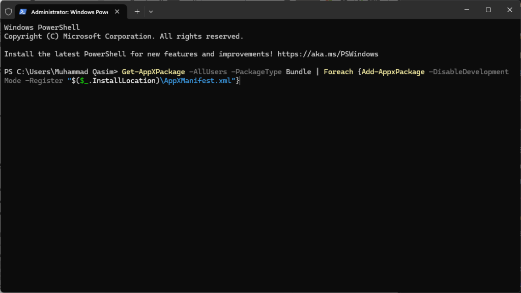 Get-AppXPackage -AllUsers -PackageType Bundle | Foreach {Add-AppxPackage -DisableDevelopmentMode -Register "$($_.InstallLocation)\AppXManifest.xml"} - Once done, restart your system to apply changes.