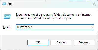 - Type wsreset.exe in the box, and click OK or press Enter to reset the Windows Store cache.