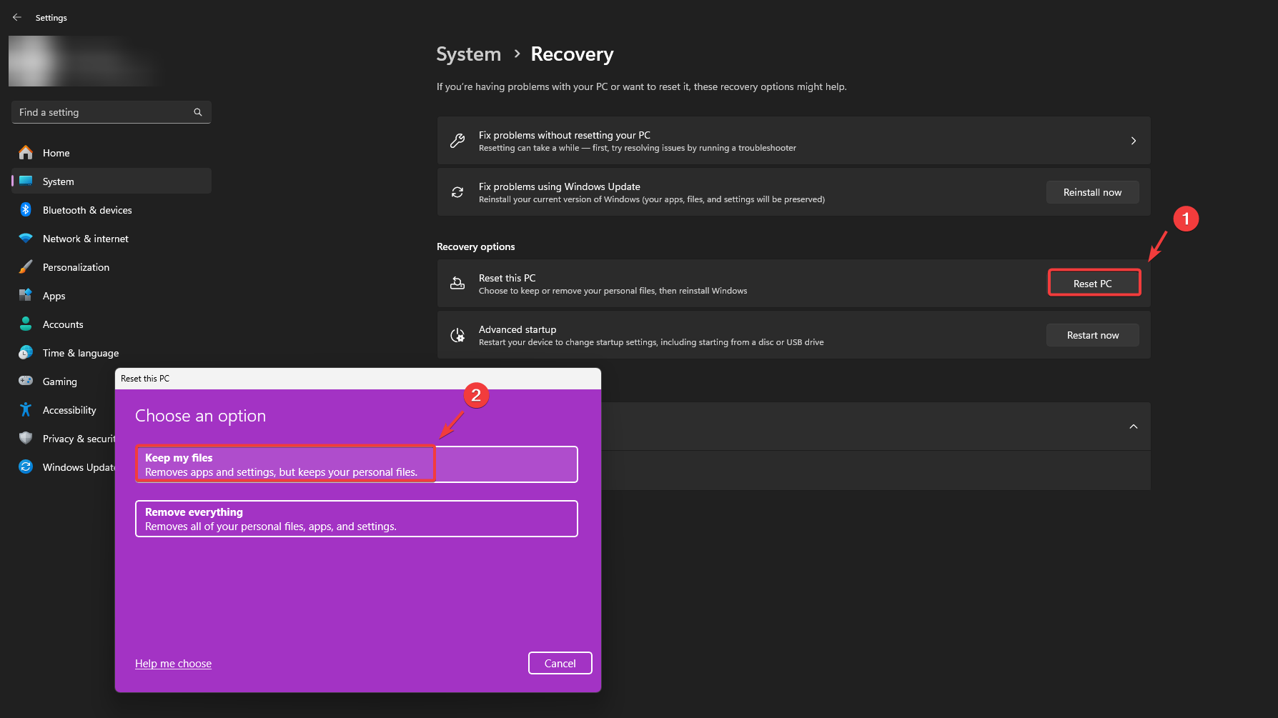 - Select Reset this PC and then choose Keep my files.