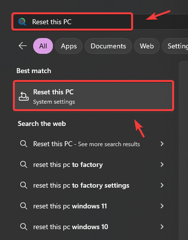 - Type Reset this PC and press Enter to access the settings.