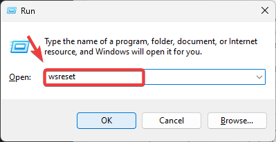 - Enter wsreset and press Enter to clear the cache.