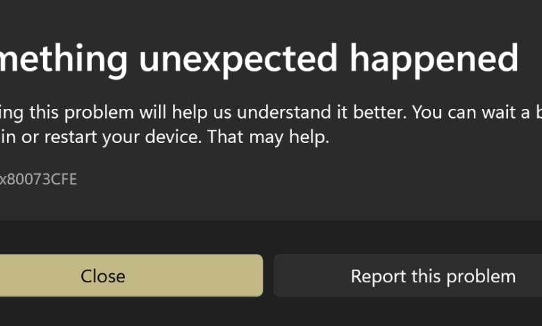 The error code 0x80073CFE, often accompanied by the message “Something unexpected happened” generally appears when you’re trying to install or update apps. This issue results from a corrupted package repository that interrupts the installation or update process. It can be triggered by corrupted system files, issues with the Microsoft Store cache, or problems related to app registration.