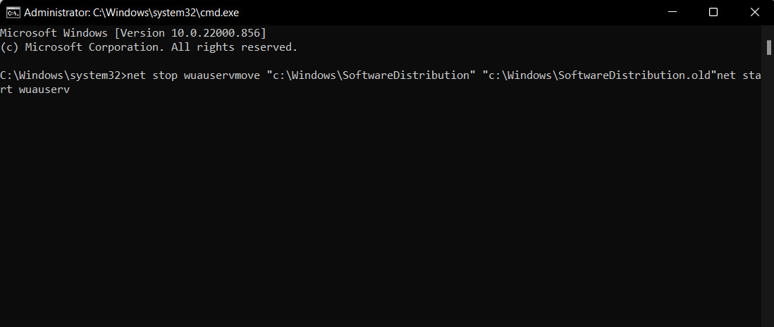 net stop wuauserv move "c:\Windows\SoftwareDistribution" "c:\Windows\SoftwareDistribution.old" net start wuauserv
