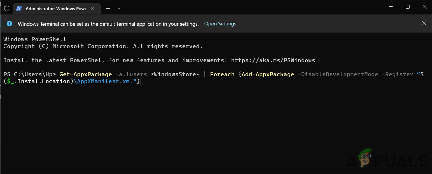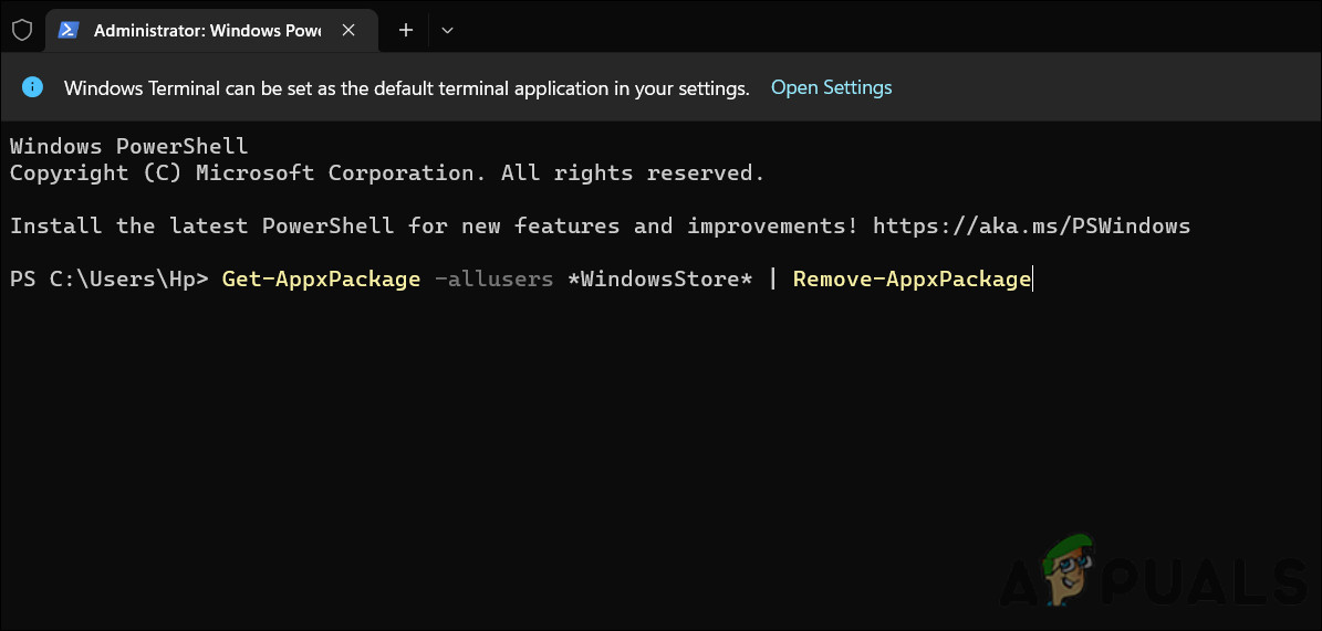 Uninstall the Microsoft Store by executing the command - After executing the command, restart your computer. Upon reboot, open Windows Terminal again with administrative privileges again.