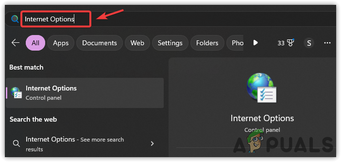 - Type Internet Options in the Windows search bar. Hit the Enter key to bring up the settings.