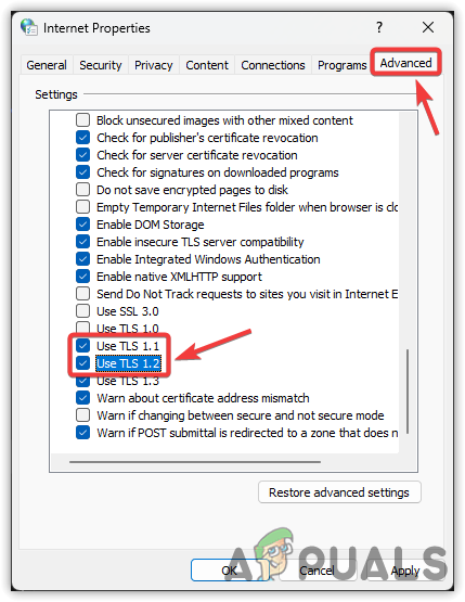- Select Use TLS 1.1 and Use TLS 1.2.
