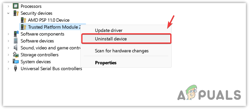 - Right-click the Trusted Platform Module 2.0 and select Uninstall.