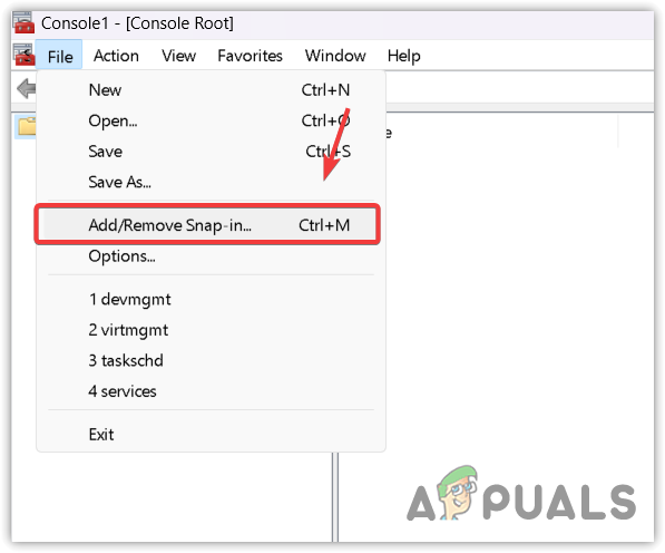 - Now click File and click Add/Remove Snap -in… You can also use Ctrl + M shortcut to navigate.