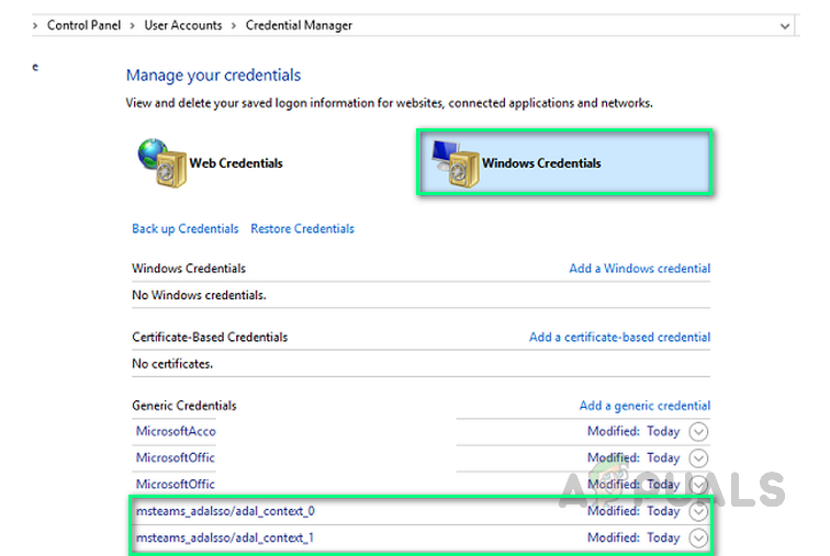 - Go to Windows Credentials and delete the msteams_adalsso/adal_context_0 and msteams_adalsso/adal_context_1 entries, as these contain the login credentials for the MS Teams desktop application.