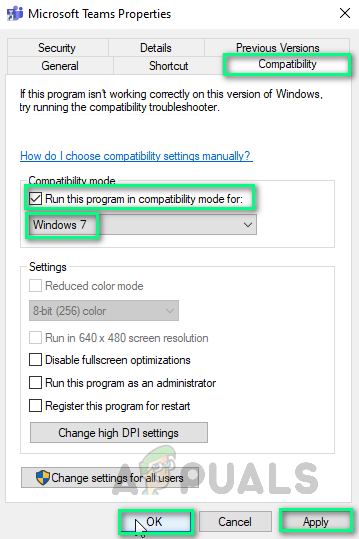 Configuring Application Compatibility Settings - Restart your PC and launch Microsoft Teams. It should now function correctly.