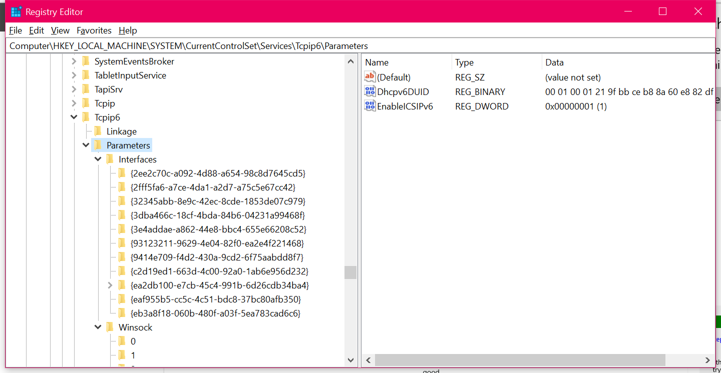 HKEY_LOCAL_MACHINE\SYSTEM\CurrentControlSet\Services\Tcpip6\Parameters