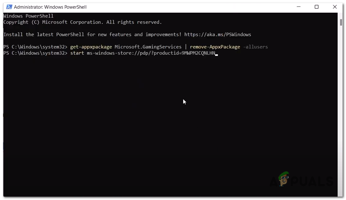 Uninstalling and reinstalling the gaming services - In the PowerShell command terminal, paste the following command to uninstall the existing gaming services package.