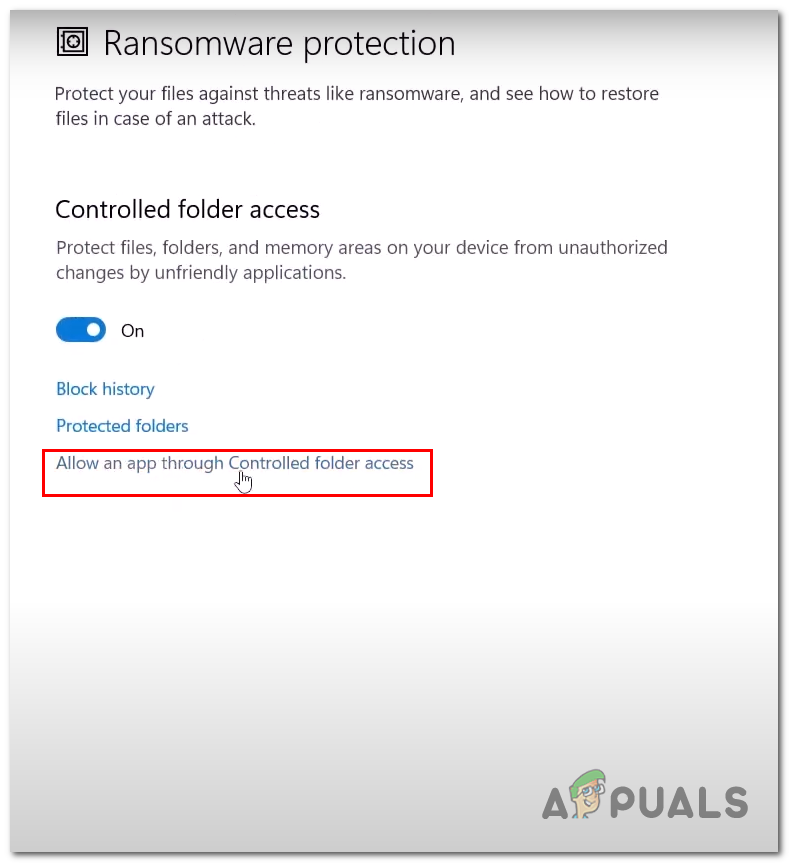 Allowing the game through controlled folder access. - Click on Allow an app through controlled folder access as shown in the image below.
