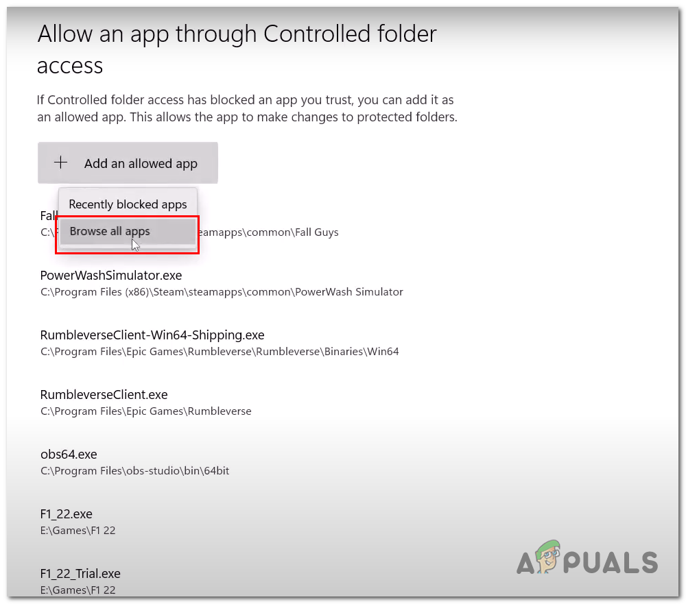Allowing the game through controlled folder access. - Now, Click on Add an allowed app.