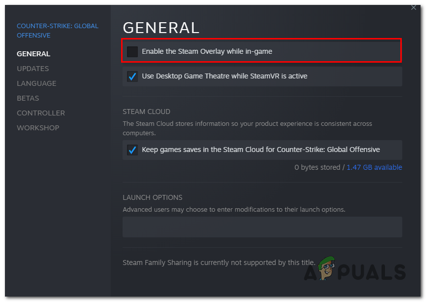 Disabling steam overlay - Uncheck the box that says Enable in-game overlay.