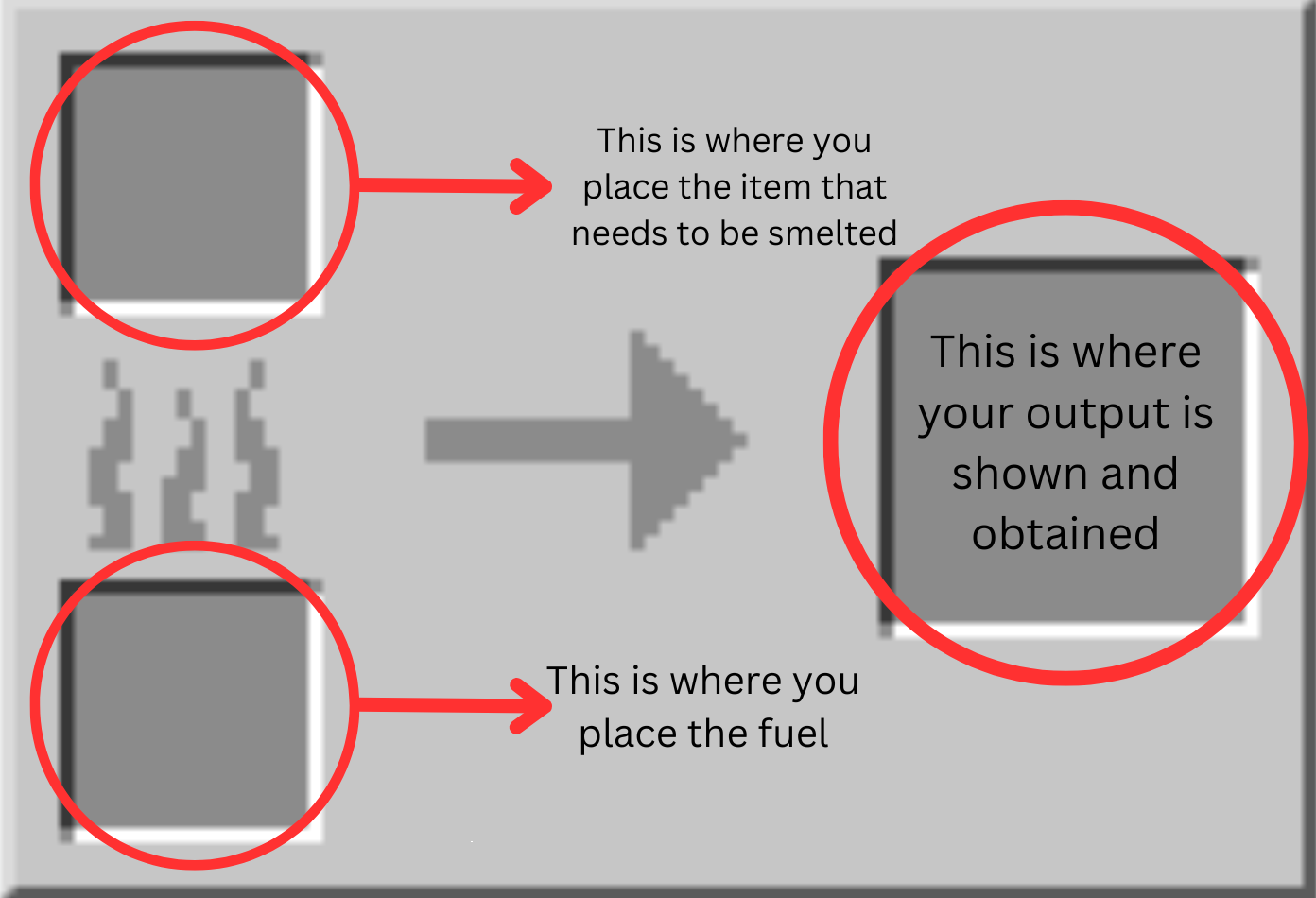 The two slots are positioned at the top and bottom. In the top slot, place the item you want to smelt or cook. In the bottom slot, place the fuel. The smelting process will begin automatically. You can pause it anytime by removing an item from any of the two left slots. The process will continue until either of the items is completely used up.