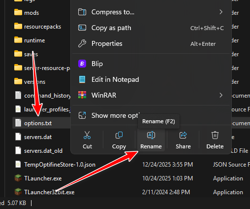 - If you use OptiFine, also rename optionsof.txt to optionsof_old.txt.