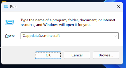 - Windows: Press Windows + R, type %appdata%\.minecraft, and press Enter.