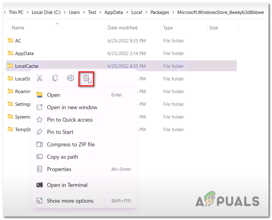 Deleting Microsoft store cache - Open this folder and Right-Click on Local Cache.